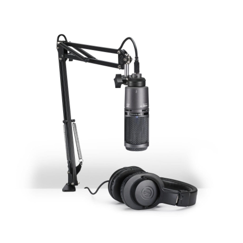 The AT2020USB+PK vocal microphone pack is designed for streamers, podcasters, and other content creators who need a versatile, easy-to-install, easy-to-adjust boom microphone setup. The pack includes an AT2020USB+ cardioid condenser USB microphone, a pair of ATH-M20x professional monitor headphones and a studio boom arm threaded with a USB cable.