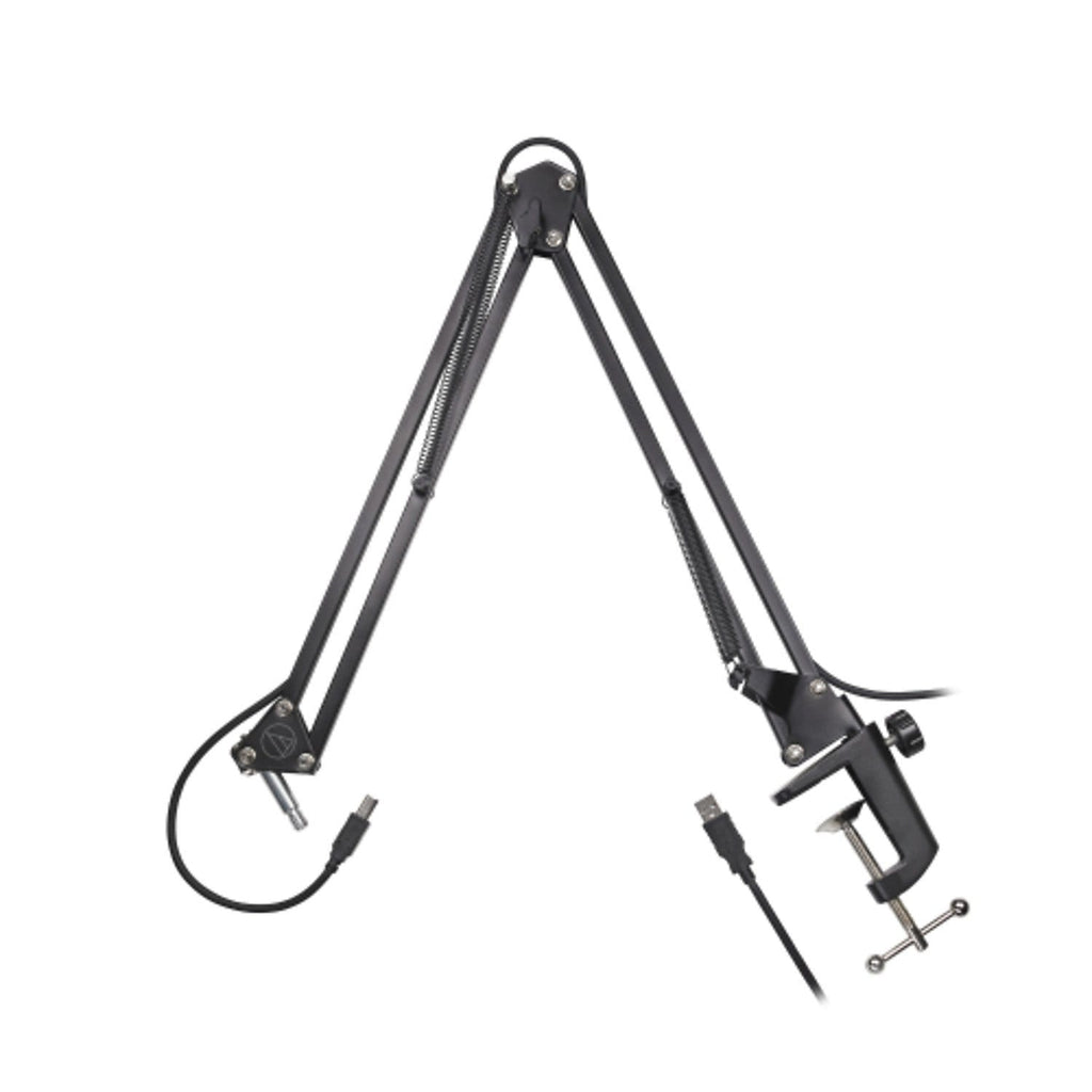 The adjustable studio boom arm clamps securely to desks, tables and other flat surfaces up to 55 mm (2.2") thick. The boom is equipped with a standard 5/8"-27 thread for easy attachment of the included pivoting microphone stand mount, and the USB cable is threaded internally for a clean appearance and unhindered operation. Offering full 360° rotation and adjustable, spring-stabilized joints, the boom arm repositions quickly for optimal mic placement.