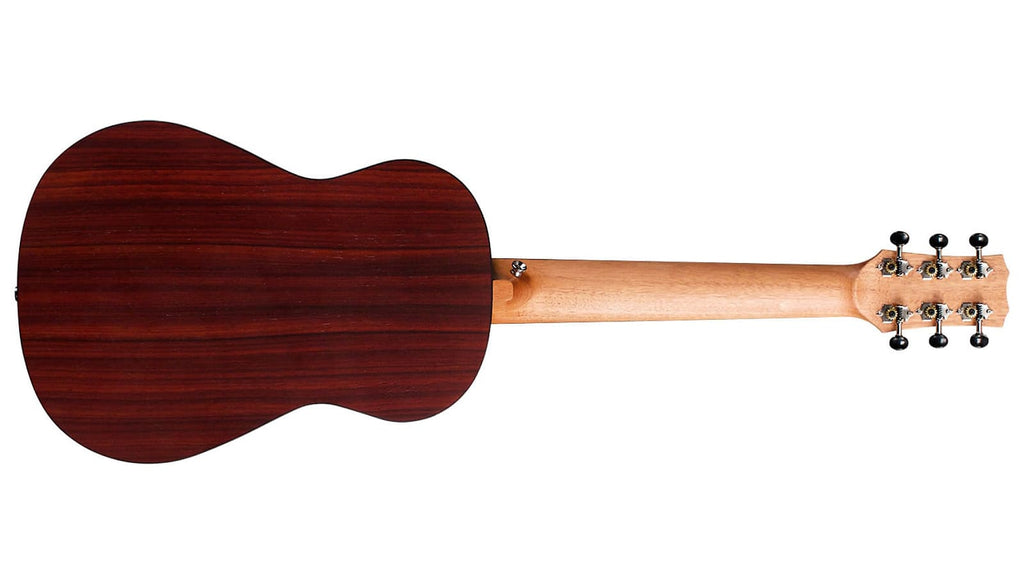 Play at home or on the go with full tone and eye-catching aesthetics! The Cordoba Mini II Padauk brings a fresh new look and solid top construction to the Mini II platform. Featuring an extended 580mm (22 7/8”) scale length which keeps standard E tuning and a 48mm (1 7/8") nut thickness for comfortable fretting. The Mini II Padauk’s solid spruce top produces a robust tone for its compact size, while exotic Padauk back and sides add warmth and vibrancy. The satin polyurethane finish provides a layer of protection against nicks and scratches. A Padauk rosette with Reconstituted Turquoise center band adds a colorful contrast. Black body binding sets off the deep red color of the Padauk.