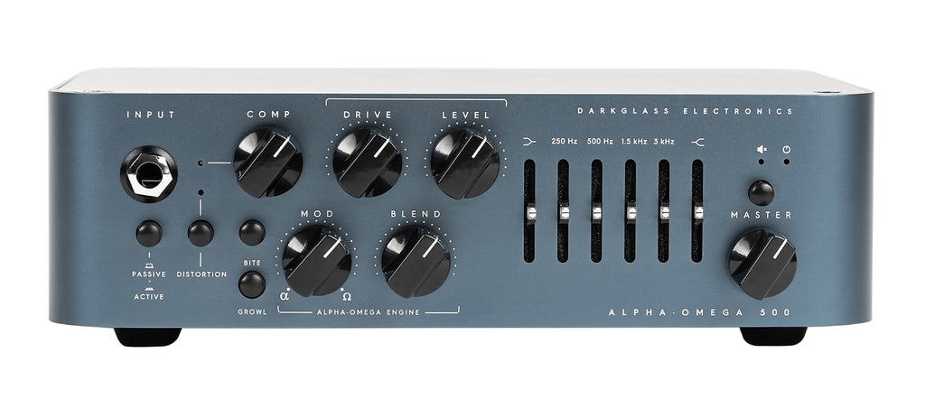 The Alpha·Omega 500 is a 500W amplifier equipped with an all-analog preamplifier, two distinct distortion circuits (Alpha and Omega), a custom-designed Darkglass high-efficiency class D Module, an ultra-quiet graphic equalizer, and a digital impulse-response cabinet emulator for DI outputs or headphones. Front Panel Features