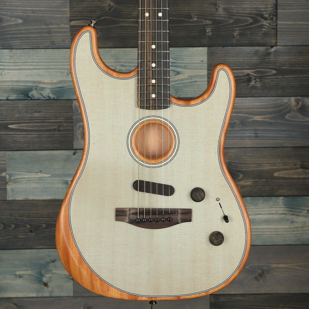 The American Acoustasonic™ Stratocaster® continues to embody the spirit of purposeful innovation that drives Fender guitars. The power of the Fender and Fishman®-designed Acoustic Engine is sure to deliver true inspiration. From acoustic shapeshifting to electric rhythm tones, this extremely versatile guitar creates a brand-new lane on the sonic highway.
