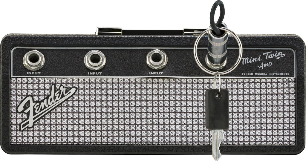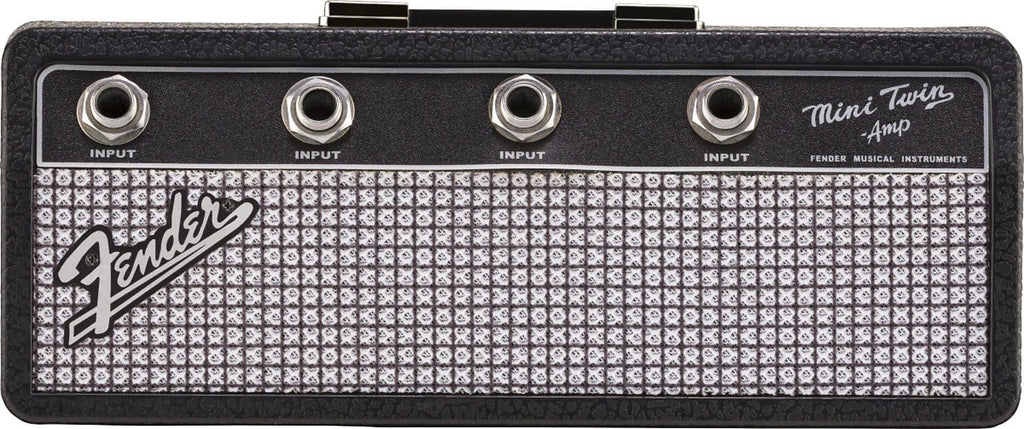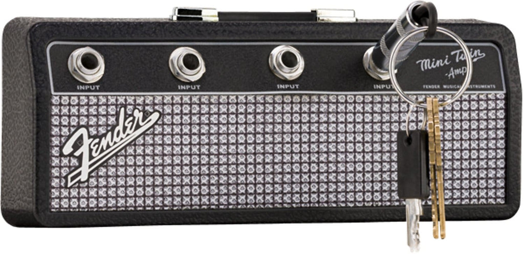 Hang your keys like a rockstar with the Fender® Jack Rack! Comes with a sleek finish, comprised of real amp materials, 4 Fender® guitar plug keychains, and 1 wall mounting kit.