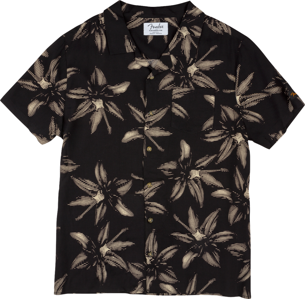 Stay Cool in this modern fit button down shirt featuring a tropical Strat Flower print. This Rayon shirt will go great for any occasion, day or night. Featuring an orange Fender® logo woven label on the left sleeve, you're definitely going to have the best shirt in the room.