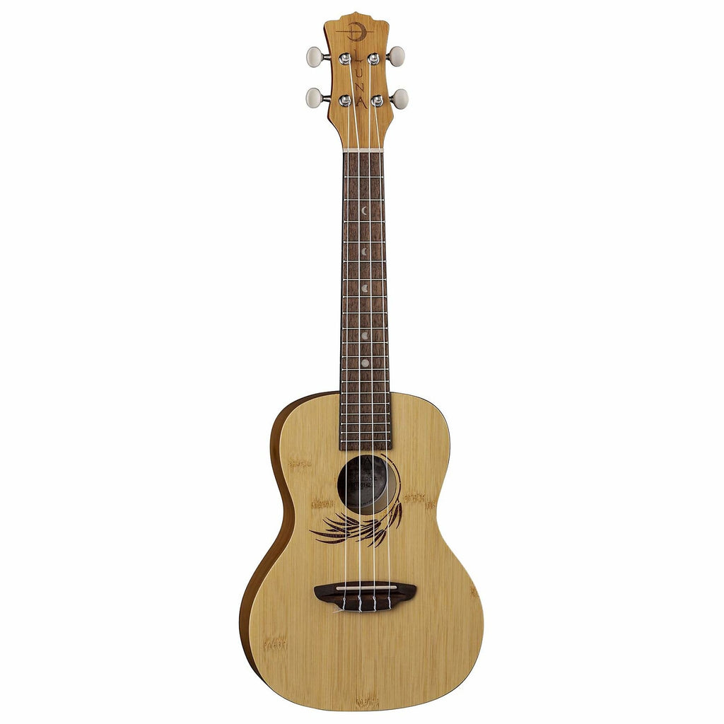 Luna continues its unique stride in the realm of exotic materials by adding Bamboo ukuleles to the mix that include Soprano, Concert and Tenor sizes. The Luna Bamboo Series is a stunning line of exotic ukuleles made from all bamboo married with aesthetically-pleasing features. The Uke Bamboo Concert is built with a 15 scale length, mahogany neck, walnut bridge and fretboard, and beautiful pearl moon phase inlays. From the laser-etched leaf design around the sound hole to the smooth ripples along the natural bamboo body, people will be stunned by this ukuleles natural beauty. Whether youre performing on stage or by yourself in a peaceful environment, one can expect a warm sound from the Bamboo Concert as it produces a sharp yet vibrant tone with every rhythmic strum. Take the exotic Bamboo Concert ukulele with you everywhere you go! This is a wonderful instrument for players of all skill levels. Branded travel bag included. Join the Luna Tribe!