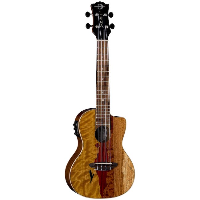 Each Vista ukulele features an aesthetically pleasing portrait of animals in their natural habitats or among wildlife, illustrated by using a variety of tropical woods. The Vista Eagle ukulele stands apart, showcasing a skillfully crafted top, made from attractive tone-woods that bring its unique artwork to life. This concert cutaway uke features a gloss finished, flamed maple binding, with the back and sides made of popular Koa wood for enhanced tone and projection. The Vista Eagle is handmade from a combination that includes Padauk, Quilt Mahogany, Koa, Flame Maple, and Birds Eye Maple, making this uke a unique work of art. Precision fitted with a hand-shaped 15 scale mahogany neck and capped with pearloid moon phase inlays on a black walnut fretboard, the Vista Eagles feel, playability, and stand-alone acoustic sound are nothing short of inspirational. Once plugged in, the Vista Eagle takes off (no pun intended) in yet another sonic direction. We equip this ukulele with a Fishman Kula preamp with onboard tuner, which offers clear, strong, natural acoustic sound on and off the big stage. Whether plugged-in or not, the Vista ukuleles project incredibly full tone, pristine clarity, and boast unique visual presence make it the ideal instrument to make your musical statement. Padded gigbag included. Join the Luna Tribe!