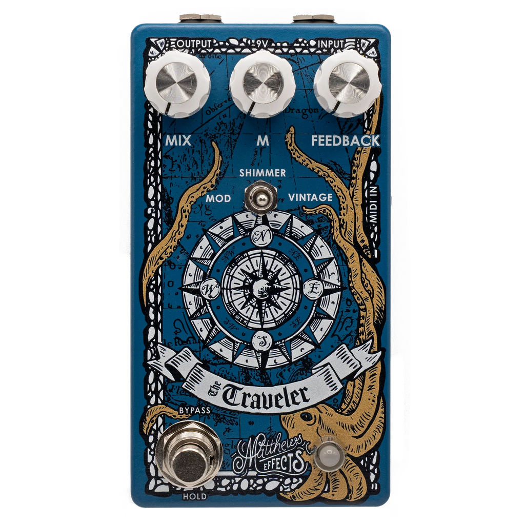 "The Traveler" also features MIDI capabilities, allowing you to control your presets, algorithms and features remotely. By holding the "Bypass/Hold" switch you activate the 'Hold" function which instantly jumps the feedback control to its max setting and then returns it to its previous place once the switch is released.