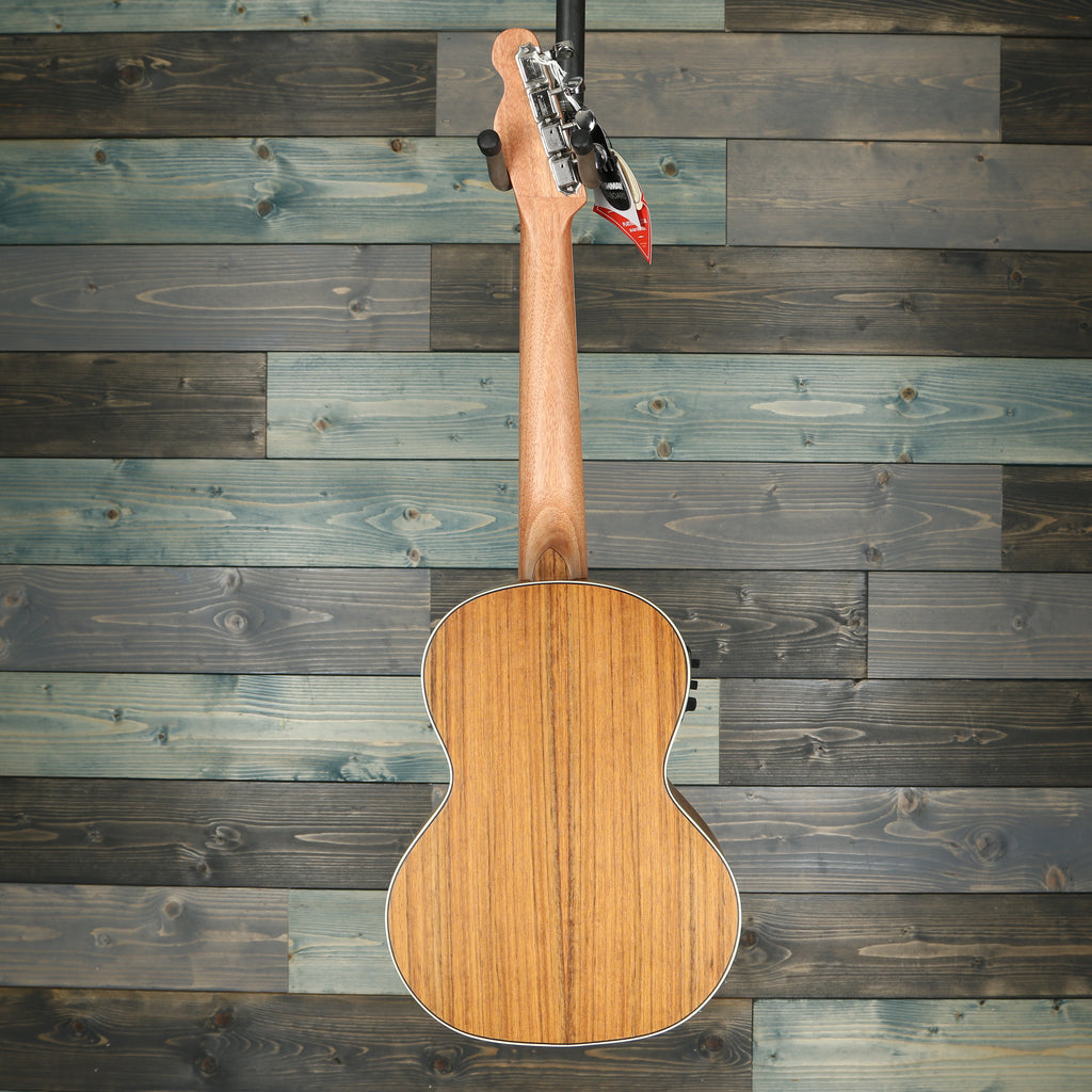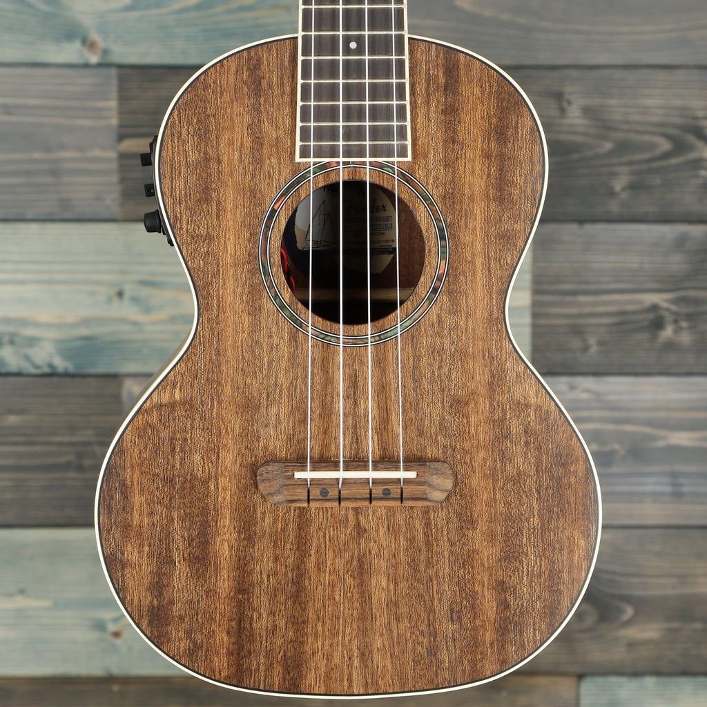 Crafted from ovangkol, with a solid top for enhanced volume, this ukulele sings with full-bodied chime while boasting a natural appearance. A pull-through bridge, bone nut and saddle, and eye-catching abalone rosette round out the modern features. The Rincon V2 now features a 4-in-line Tele® headstock with vintage-style closed-back tuning machines, for that unmistakably classic Fender look.