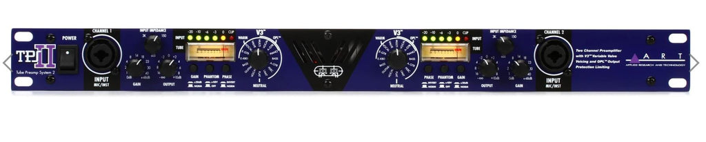 The TPS II (Tube Preamp System 2) is a 2-channel high performance preamp that's as versatile as it is affordable. It makes a great addition to any project or professional studio. The flexible TPS II features ART's proprietary V3 (Variable Valve Voicing) technology, and it also provides variable input impedance, which lets you dial in and match any mic type from large condensers to ribbons. The TPSII's legendary tube stage maintains the classic "warm sound" and adds additional tube voicing specifically tailored to vocal, guitar, bass, and acoustic instruments, making the TPS II an incredible DI box. ART's OPL (Output Protection Limiting) feature is also included to control overshoots and normalize levels before clipping occurs.