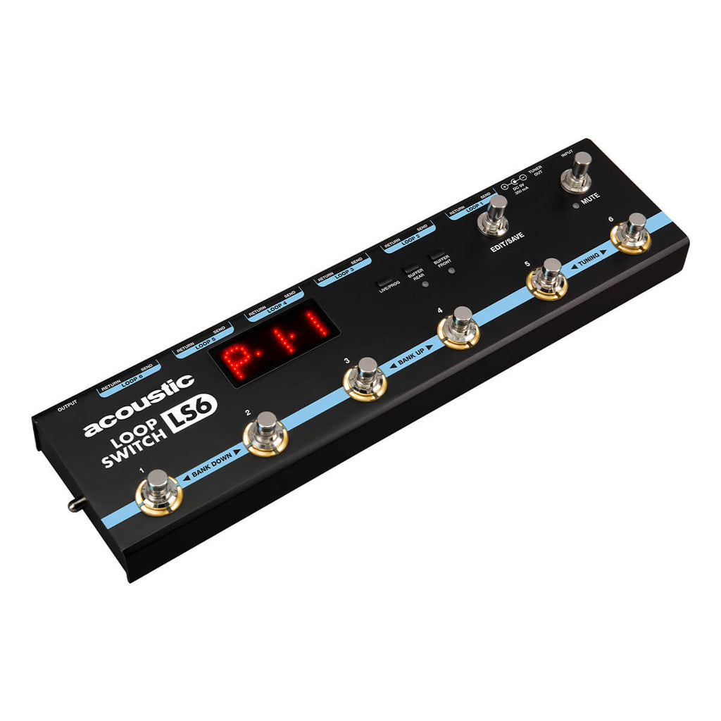 A large, easy-to-read LED readout display provides clear visual feedback when performing in dark performance venues. Dual operation mode offers access to individual pedals in Live mode, or complex preset programs in Program mode. The six silent footswitches allow or quiet operation during loop selection, bank navigation and built-in tuner operation—with a dedicated Mute switch that allows for silent tuning or instrument changes. Plus, you’ll find a Tuner Out jack to feed an unaffected signal to your favorite external tuner. Front and back signal chain buffering options provide quiet signal path and compensation for longer cable runs. The Acoustic LS6’s rugged, all-steel enclosure also stands up to rigorous use for years of reliable service