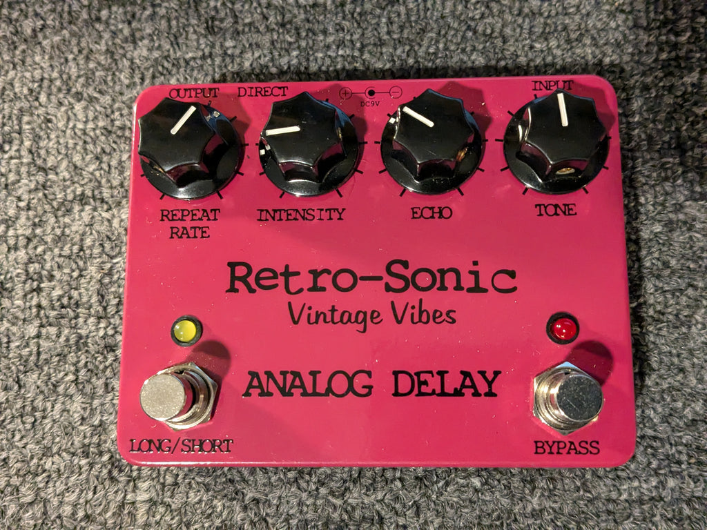 To create a vintage sounding analog delay, we used the famous DM-2 as the starting point for the design. The Retro-Sonic Delay has the usual controls: Repeat Rate, Intensity and Echo. An additional control alters the tone of the repeats (hi-cut filter), allowing for darker and softer repeats. The unit delivers up to 800ms of delay time using two 4096 stage BBDs. Quality components and signal filtering ensure quiet operation. Two footswitches provide selection for effect/bypass (true bypass), and the selection between the short and long delay path (~400ms and ~800ms). This enables finer control over the short delay range effectively providing a delay and slap-back selection at your foot.