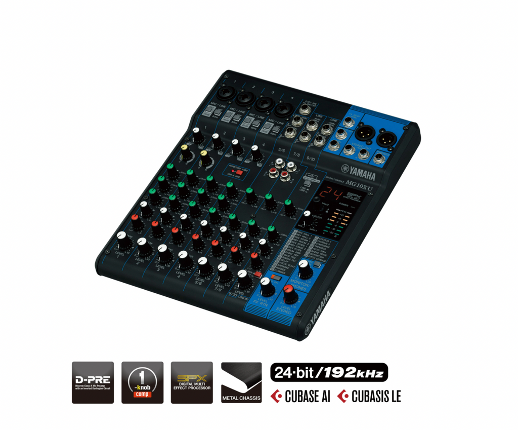 10-Channel Mixing Console: Max. 4 Mic / 10 Line Inputs (4 mono + 3 stereo) / 1 Stereo Bus / 1 AUX (incl. FX)